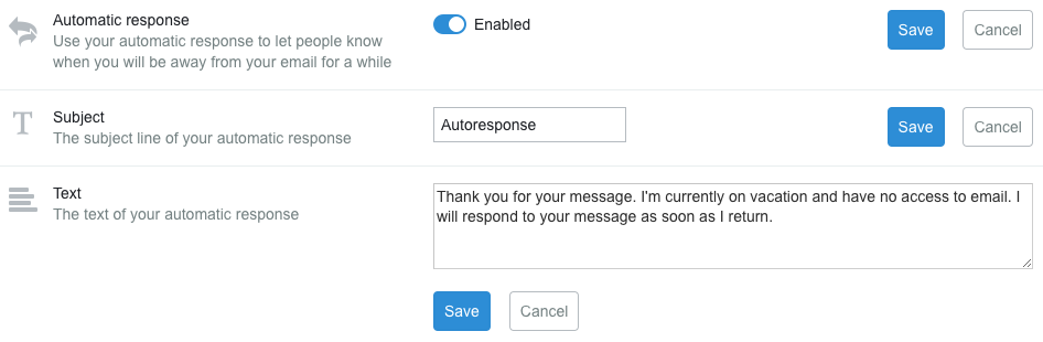 To disable your automatic response, set the Automatic Response option to Disabled, then click Save. You can leave the subject and text to reuse next time you are away.