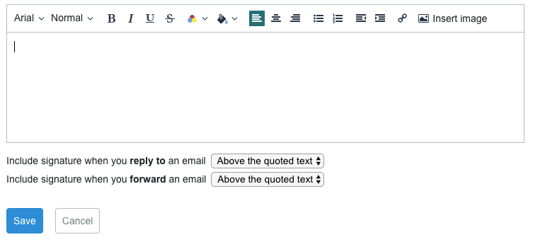 - Enter your email signature. You can then select whether or not it should appear when you reply to an email, or forward an email. When you are done, click Save.