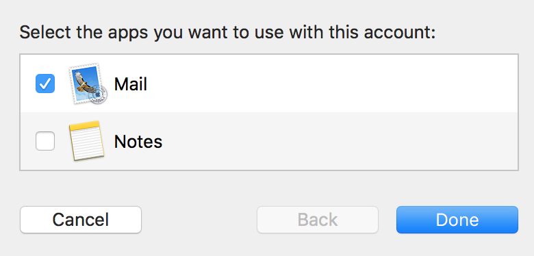 On the next screen, select Mail, then click Done. Your account should now be successfully added to Mac Mail