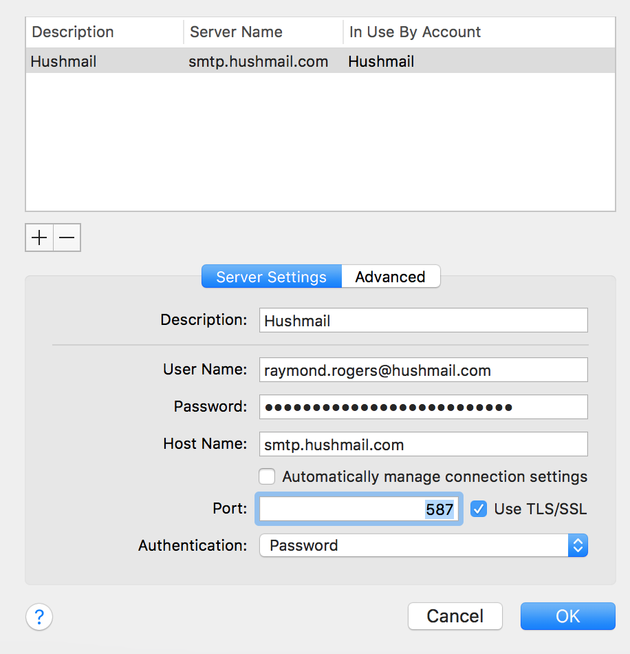- Select the smtp.hushmail.com server name from the list at the top, and select Server Settings. Then, uncheck the Automatically manage connection settings box, and ensure the following information is shown: