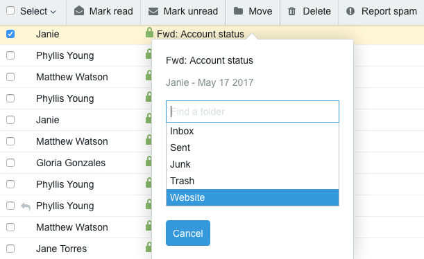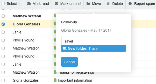 To search for a folder by name, just start typing the name of the folder you are looking for. The list below will update. Select the desired folder from the list to move your message. If the folder doesn't exist, the system will automatically give you the option to create a new folder on the fly: