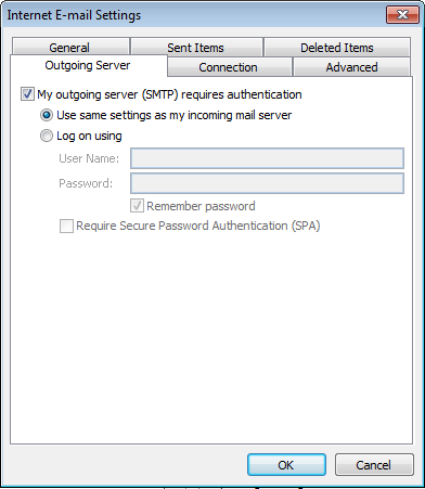 Select My outgoing server (SMTP) requires authentication and Use same settings as my incoming mail server.