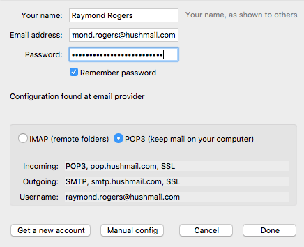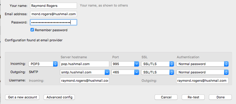 Username: your full Hushmail email address - When you have finished, click Done. If Done is greyed out, you may need to click Re-test first.