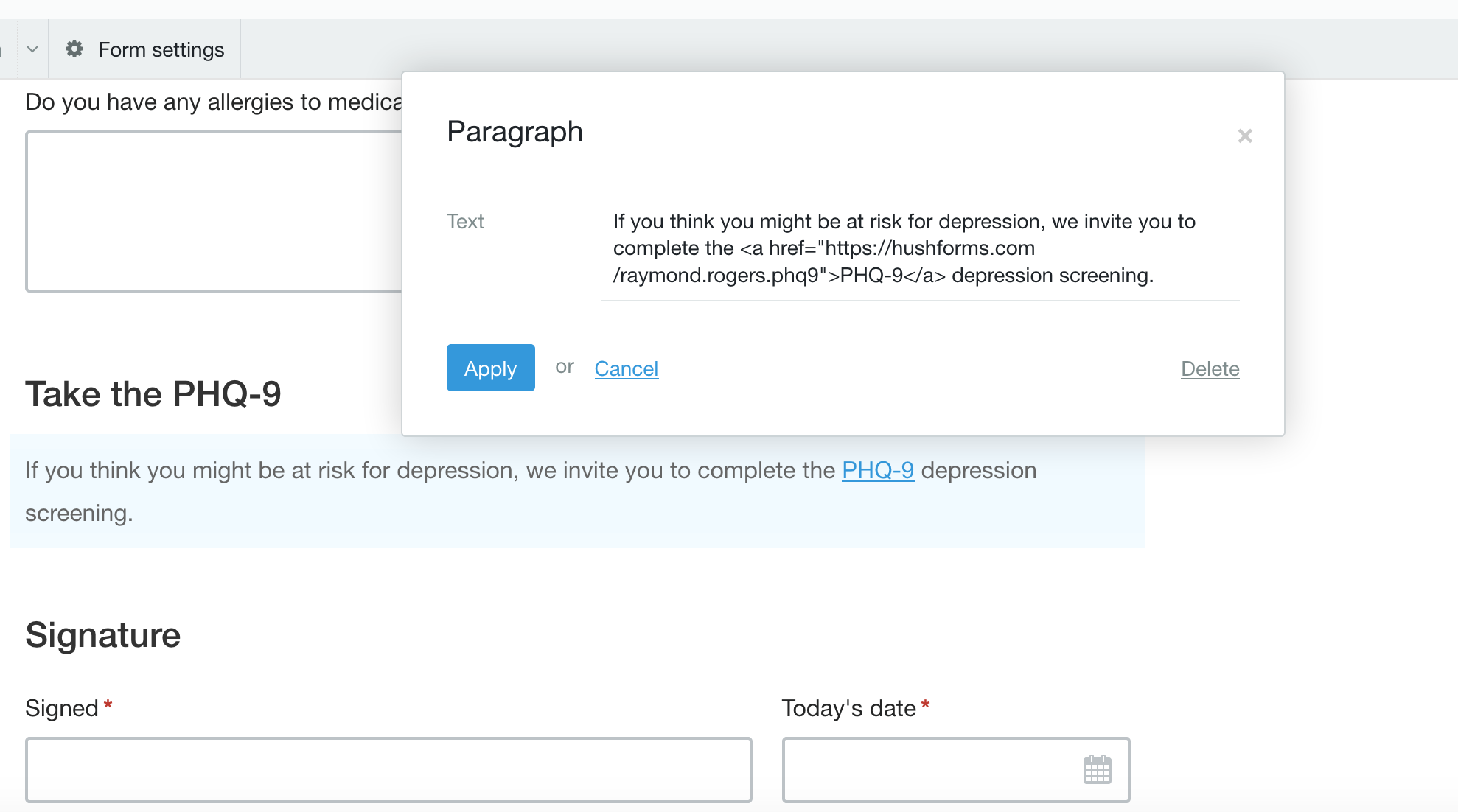 Including links within your form is a useful way to easily direct your clients to additional information. For example, you may want to link to your privacy policy and terms of service. Or you may want to link to another form. In the example, below Dr. Rogers invites clients filling out his New Client Questionnaire to take the PHQ-9 depression screening.